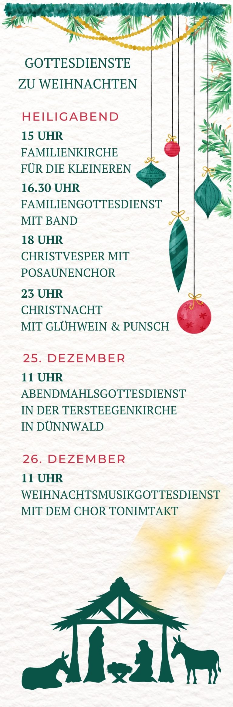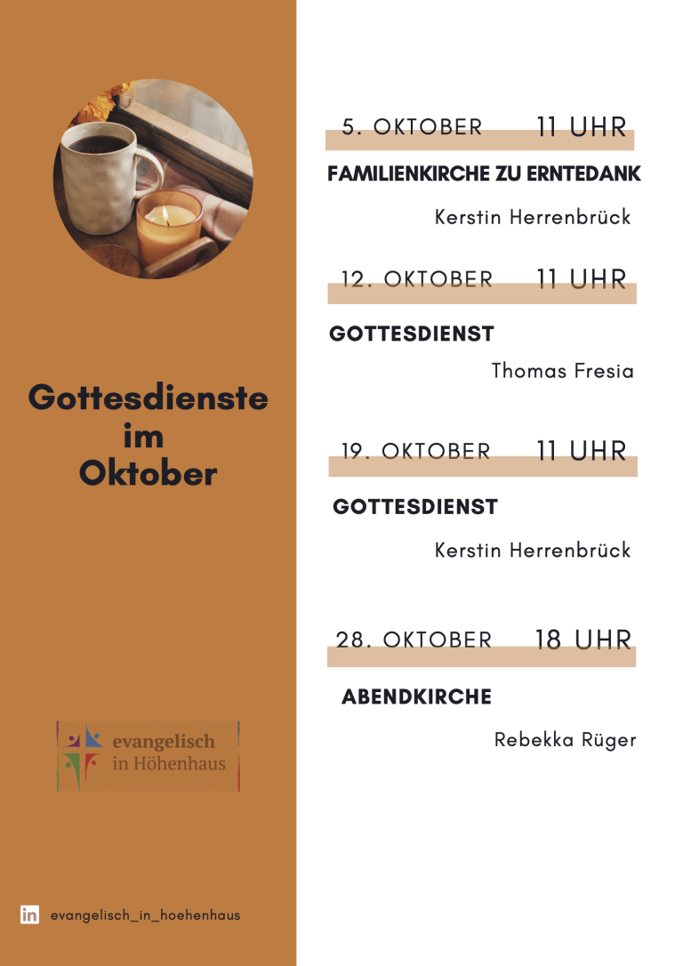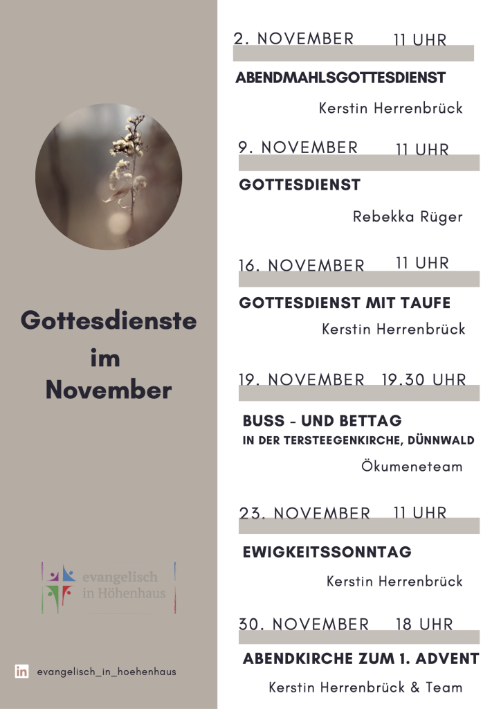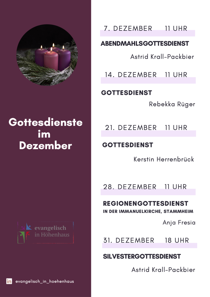 Gottesdienste Wir feiern unseren Gottesdienst am Sonntag Morgen um 11 Uhr und 1x im Monat als Abendkirche um 18 Uhr! Zu besonderen Anlässen können sich Uhrzeit und Ort ändern. Die jeweils aktuellen Zeiten und Orte zu jedem Sonn- und Feiertag können Sie dem Gottesdienstplan entnehmen. Hier sind wir zu finden Ev. Pauluskirche, Dreisamweg 9, 51061 Köln-Höhenhaus Ev. Tersteegenkirche, Amselstr. 22, Köln-Dünnwald | Ev. Immanuelkirche, Bonhoefferstr. 8, Köln-Stammheim | Ev. Friedenkirche, Wallstr. 9, Köln-Mülheim